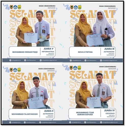 Dalam ajang OSN, perwakilan SMAN 3 Banjarbaru berhasil meraih prestasi di tingkat kota setelah melewati serangkaian seleksi yang ketat. Keberhasilan ini menunjukkan kualitas pembelajaran dan semangat belajar tinggi yang dimiliki oleh para siswa.