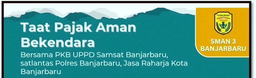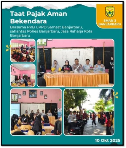 SMA Negeri 3 Banjarbaru menggelar kegiatan “Sosialisasi Taat Pajak dan Aman Berkendara” bekerja sama dengan PKB UPPD Samsat Banjarbaru, Satlantas Polres Banjarbaru, dan Jasa Raharja Kota Banjarbaru. Kegiatan ini dilaksanakan di Laboratorium Fisika SMAN 3 Banjarbaru dan dihadiri oleh perwakilan siswa dari kelas X, XI, dan XII.